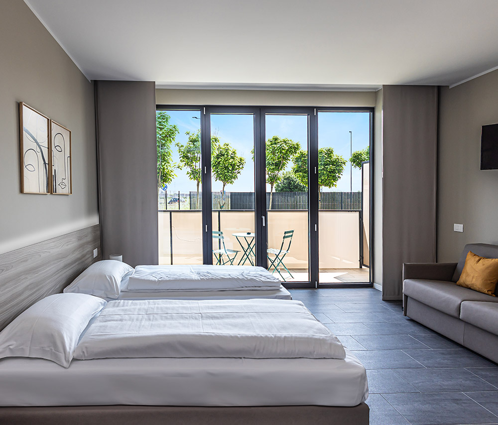 - 48 Monolocali su 4 piani: Scegli tra letti matrimoniali o due letti singoli, tutti dotati di divano letto per un’ulteriore comodità.